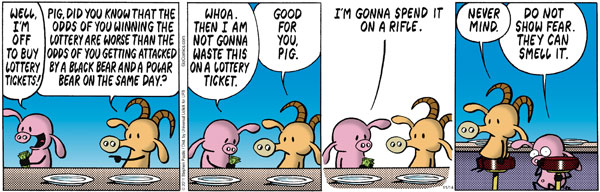 Odds of winning the lotery Posted on November 14, 2011 by Mr. Chase Pearls Before Swine [Hat tip: Tim Chase] Share this: Click to email a link to a friend (Opens in new window) Email TweetLike Loading... Related